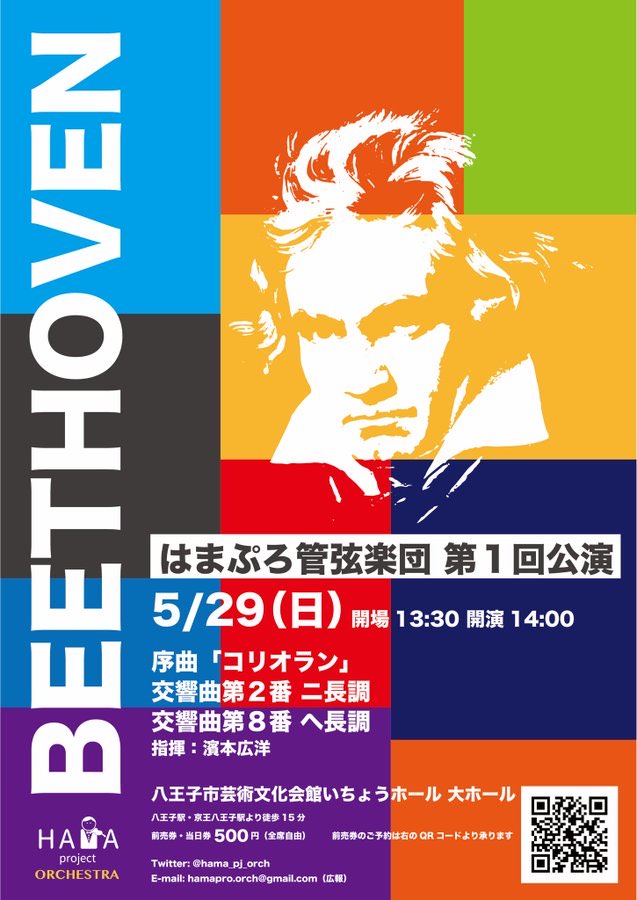 第1回公演 orchestra 2022.05.292025.08.27 第1回公演(旧はまぷろ管弦楽団) ベートーヴェン・ツィクルス第1弾 公演情報 日時 2022年5月29日[日] 14:00 会場 八王子市芸術文化会館いちょうホール 大ホール チラシ PDFを開く(両面) 出演 指揮:濱本広洋管弦楽:Hamamoto Orchestra Project プログラム ベートーヴェン/序曲「コリオラン」ベートーヴェン/交響曲第2番ベートーヴェン/交響曲第8番